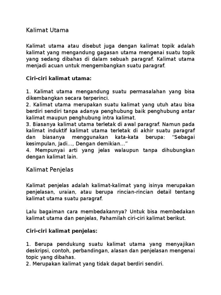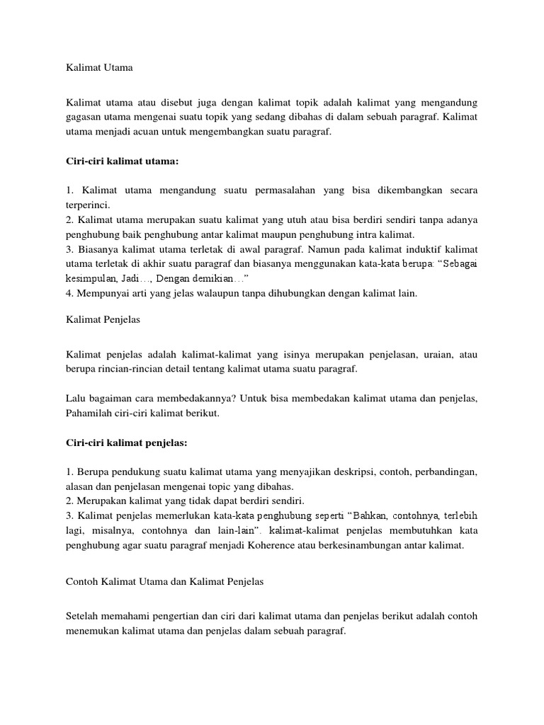 Ciri Ciri Kalimat Utama Dan Kalimat Penjelas from imgv2-2-f.scribdassets.com Untuk itu marilah kita simak penjelasan dibawah ini secara rinci dan semoga dapat dengan mudah dipahami oleh si pembaca. Kalimat utama dapat berdiri sendiri dan memiliki arti yang jelas, sehingga tidak dibutuhkan konjungsi, baik antar kalimat maupun intra kalimat. Suatu paragraf yang baik pasti berisi dua jenis kalimat yang merupakan informan dari maksud paragraf dibuat. Apa sih sebenarnya kalimat penjelas? Kalimat utama dan penjelas haruslah ada di dalam sebuah paragraf agar sebuah paragraf dapat dikatakan sebagai paragraf yang baik. Merupakan pendukung gagasan pokok/kalimat utama. Seperti pada definisinya, kalimat majemuk ini memiliki lebih dari satu subjek dan satu predikat. Pasti sudah sering kita dengardengar mengenai kalimat utama dan kalimat penjelas di bangku sekolah mulai sejak sekolah dasar atau bahkan sampai sma disini juga kami paparkan mengenai tentang pengertian kalimat utama, letak kalimat utama, contoh kalimat utama.